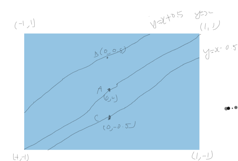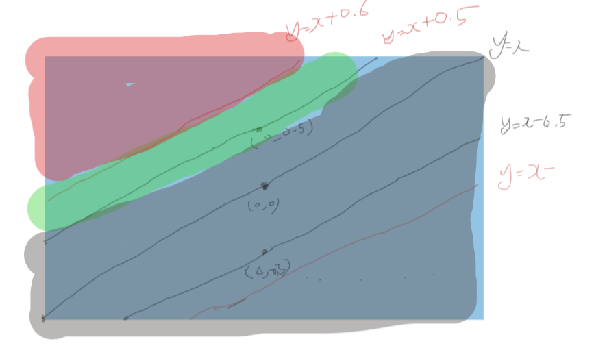 y = x - 0.5 그래프와 y = x + 0.5 그래프 두개를 그려보면 아래와 같습니다.