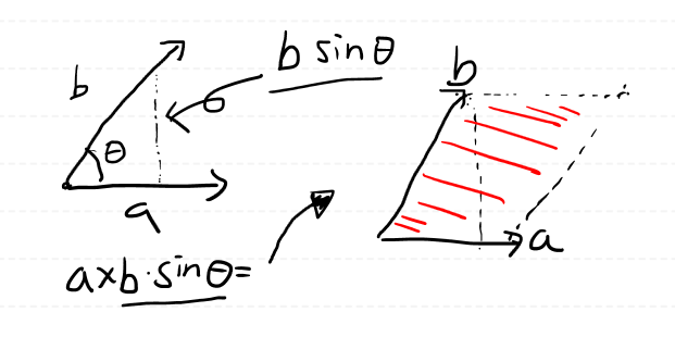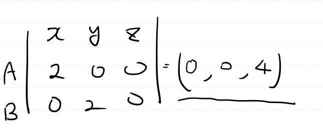 2) A ,B의 외적 값은 A, B벡터와 수직인 벡터 C의 길이와 같다.