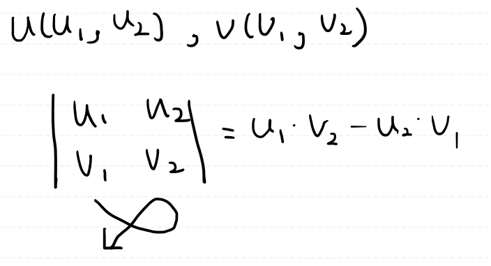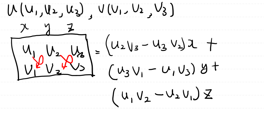 내적과 마찬가지로 U, V는 벡터이며, 외적의 결과는 2차원인 경우 스칼라 값이며 3차원인 경우 벡터 입니다.