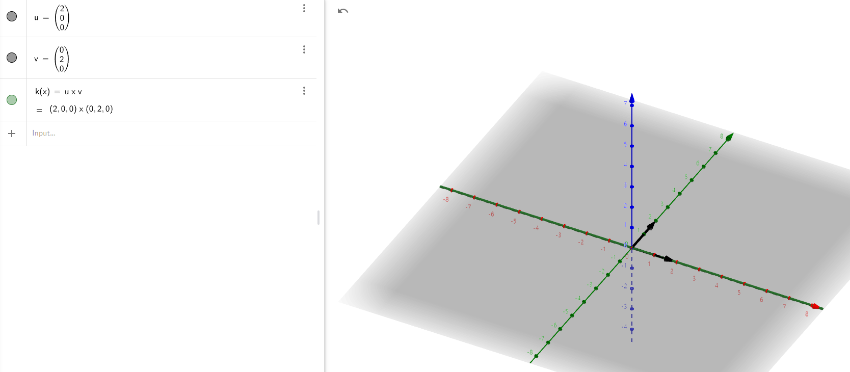 검은색 선 A, B(검정)의 외적 한 결과 C(파랑)는 A, B 벡터의 수직 임을 확인했습니다.