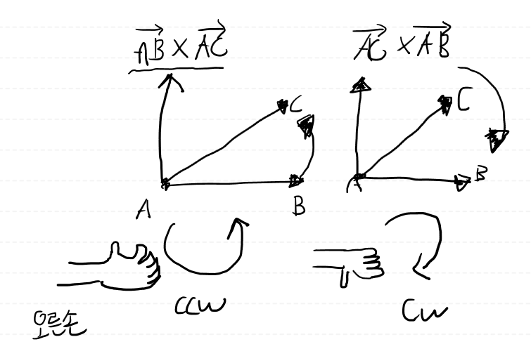 AB 벡터와 AC 벡터의 외적 값이 > 0, 양수 라면 반시계방향(CCW) 이며,