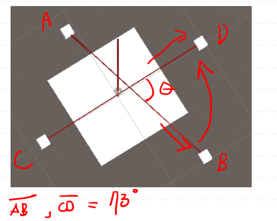 외적을 통해서 AB벡터와 CD벡터의 노멀벡터의 방향, 즉 오른손의 법칙을 적용하면