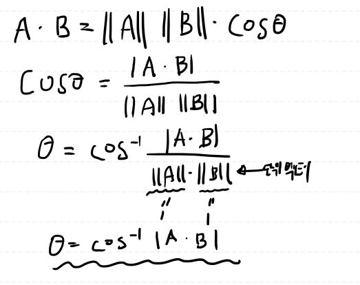 Line과 Line 사이의 각도를 알기 위한 식은 내적 공식을 사용 합니다.