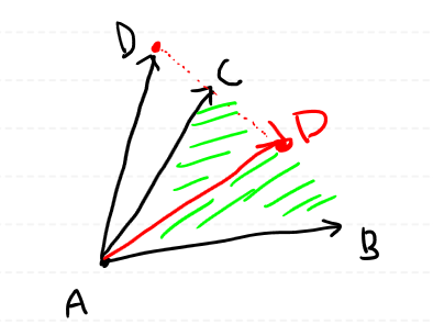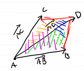 여기서 D 점이 ABC 평면 위에 있으면 AB, AC, AD 벡터는 전부 동일한 평면에 있게 됩니다.