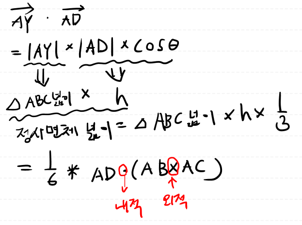 위 내적의 결과을 3으로 나누어주면 정사면체의 부피가 나옵니다.