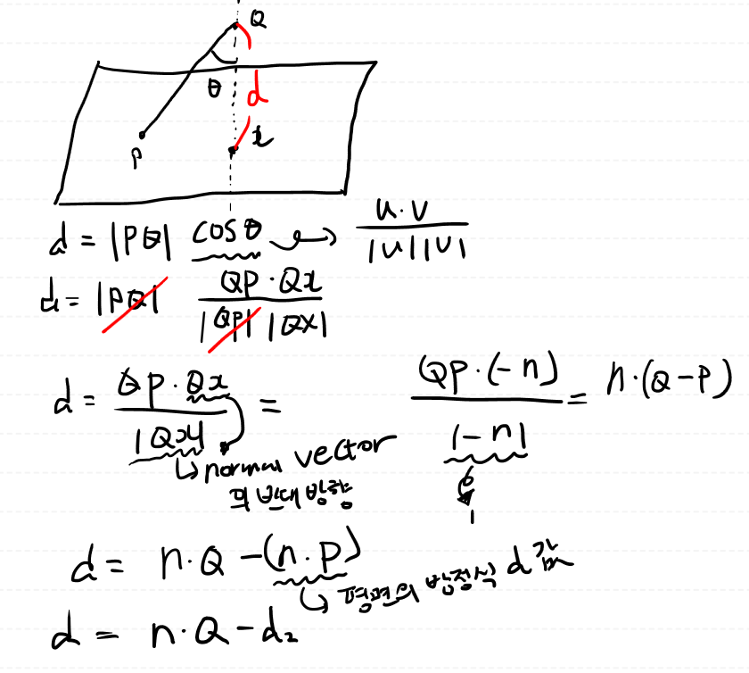 QX 벡터의 경우 평면의 노멀벡터(XQ) 의 반대방향이기 때문에 -n 이라고 표현 한 것이다.