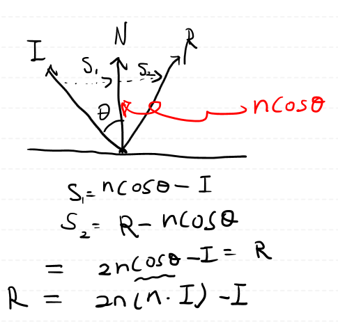카메라 방향벡터가 I라고 한다면, I와 지면의 P점에 반사된 방향벡터가 R 입니다.
