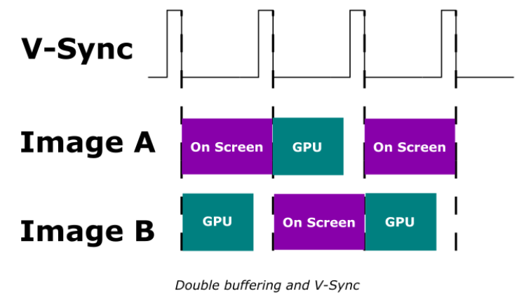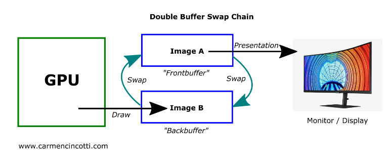 스왑체인으로 부터 할당된 이미지 A, 이미지 B는 V-sync 타이밍 마다 스왑이 되면서 이미지의 내용이 출력이 됩니다.