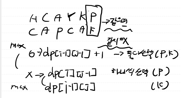 - Dp[i][j] = 첫번째 문자열의 길이 i, 두번째 문자열의 길이 j 일때 최장 공통 부분 수열 길이
