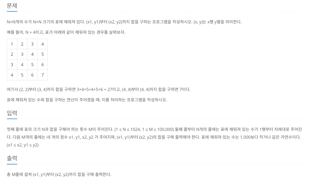 - dp[i][j] = 0, 0 ~ i, j 인덱스 까지 구간합