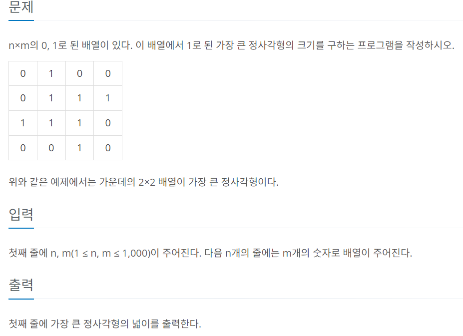 - dp[i][j] = i, j 인덱스 일때, 최대 정사각형의 변의 길이