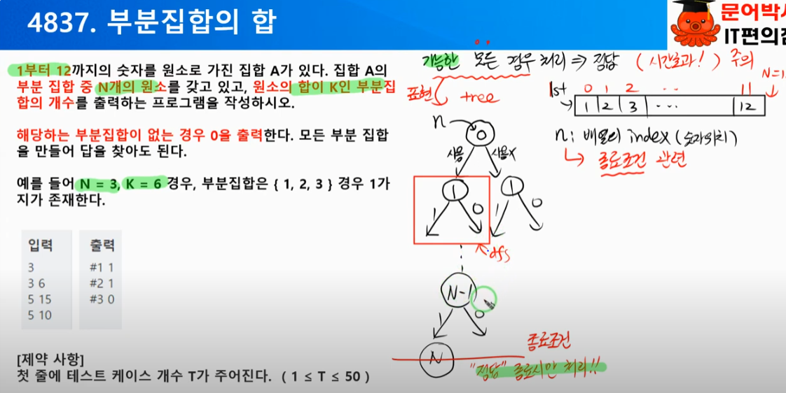 - 집합 A에서 N개의 원소를 조합하여, 원소의 합이 S인 부분집합의 개수를 구하여라
