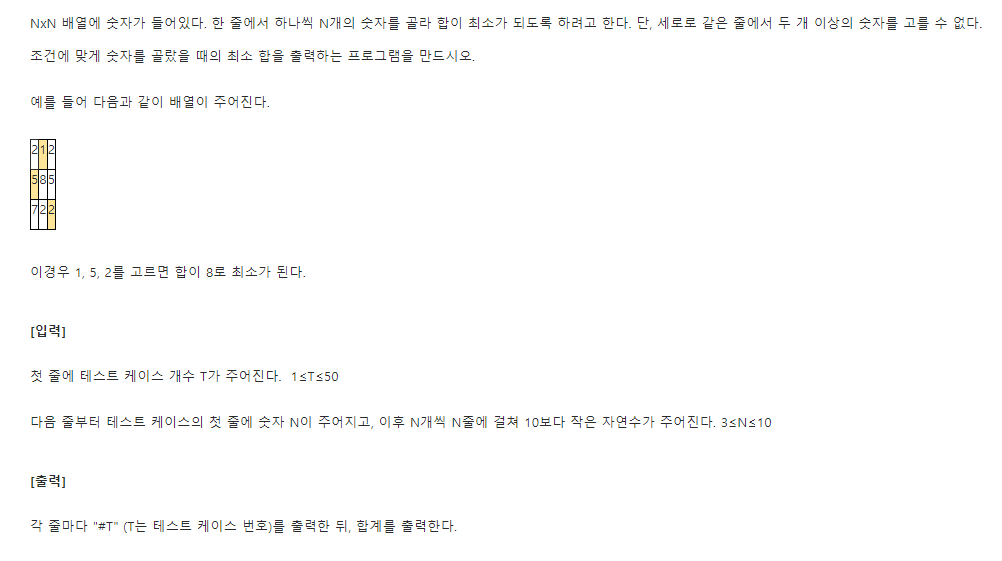 - i행 j행의 숫자를 골랐을때 (세로같은 줄 X), 최소 합을 구하여라.