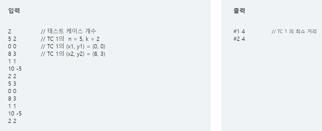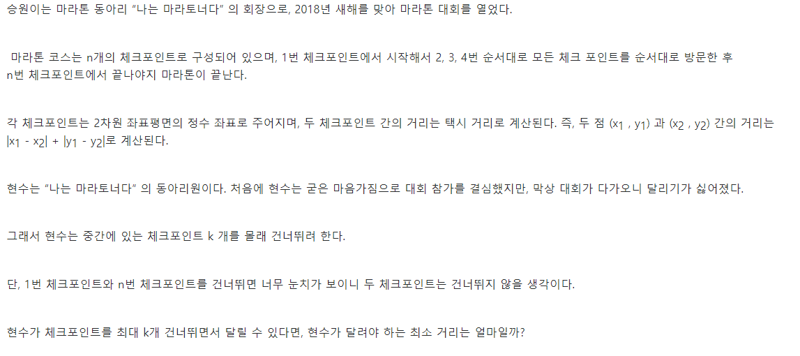 1) 체크포인트를 방문하거나, 건너 뛰는 경우 (반드시 K번 건너뛰어야 함) N번 체크포인트에 도착했을때 최소 거리.