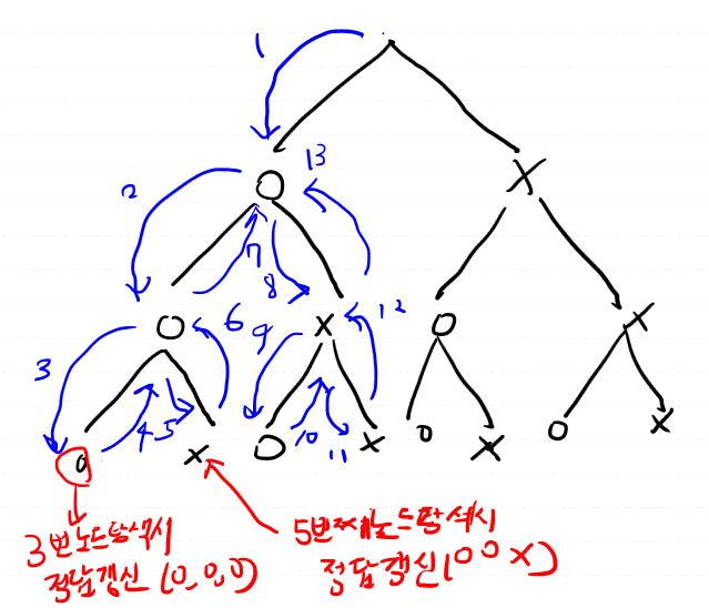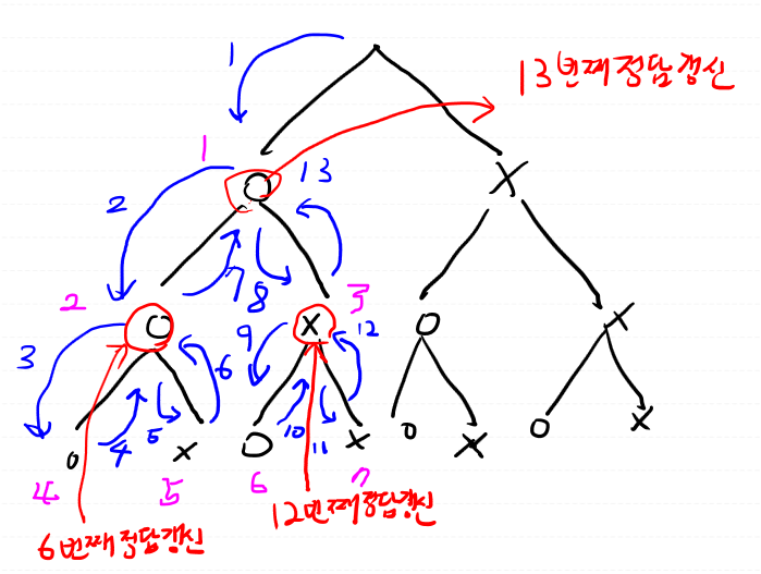 ○ 1번 노드를 제일먼저 호출하지만, 1번 노드 모든 자식노드를 탐색 후 제일 마지막 정답갱신 (하양식)