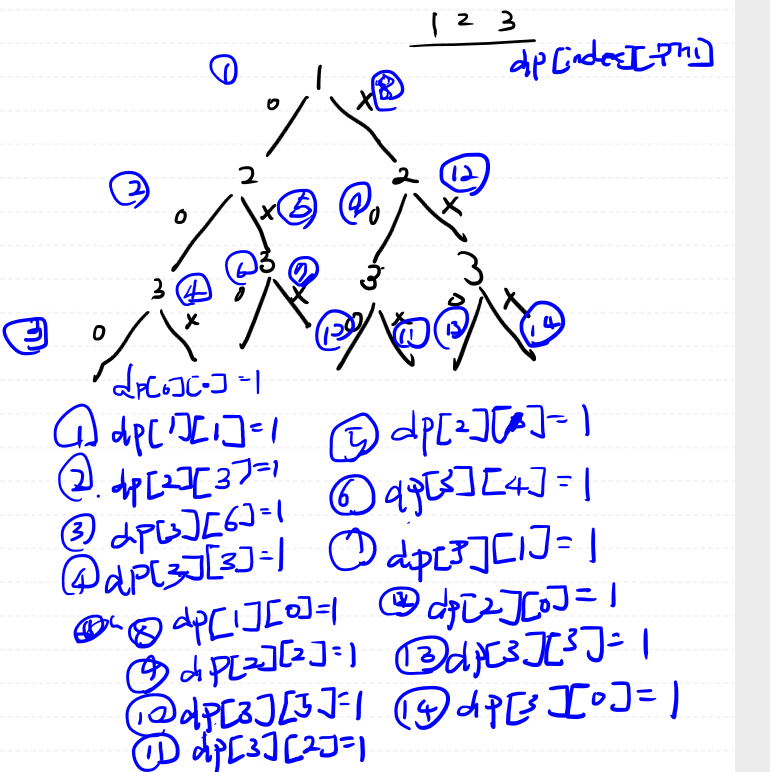 - 1번 탐색시, 22번 노드에서 dp[4][3] = 1을 미리 저장해 놔야 한다.