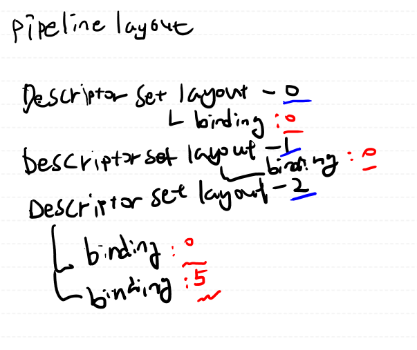 - 위 예제에서는 1번 디스크립터 세트 레이아웃 내부에 3개의 디스크립터 세트 레이아웃 바인딩이 있다.