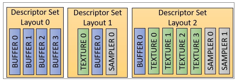 디스크립터 세트는 주어진 리소스 (유니폼 버퍼, 샘플 이미지, 저장된 이미지) 등을 셰이더에 연결하며