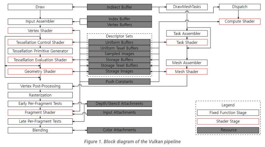 Vulkan 그래픽 파이프라인은 OpenGL과 동일 합니다.차이점은 그래픽 파이프라인의 모든 단계를 개발자가 명시적으로 설정 해야합니다. 파이프라인을 생성하고 바인딩 하면 파이프라인을 사용할수
