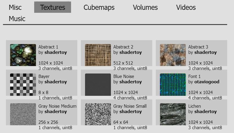 아래 텍스처 중에 " Gray Noise Small "텍스처를 채널 0번 버퍼로 입력받는다.